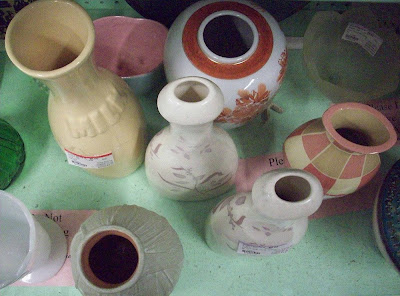 On Saturday Pam and I went to downtown Sarasota at the farmers' market to get some peppers and watch dogs sniff butt and tow their masters and mistresses. Afterwards, we stopped by Womens' Exchange to see the Big Sale, 75% off on select items. Justice (below) was a little too big for my kitchen apothecary. So I unzipped the trusty little Kodak camera bag which hangs on my belt and started checking price stickers.