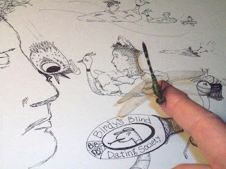 Ninety minutes or so passed and the dragonfly stuck to my finger, making it difficult to continue my pen-and-ink doodlings. We were attached. I didn't have the heart to shake him off my finger.