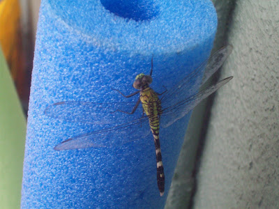 Finally, after some gentle coaxing, the dragonfly attached itself to a sturdy, blue-foam, pool-noodle. Fifteen minutes later, the dragonfly lifted off the noodle and flew away.